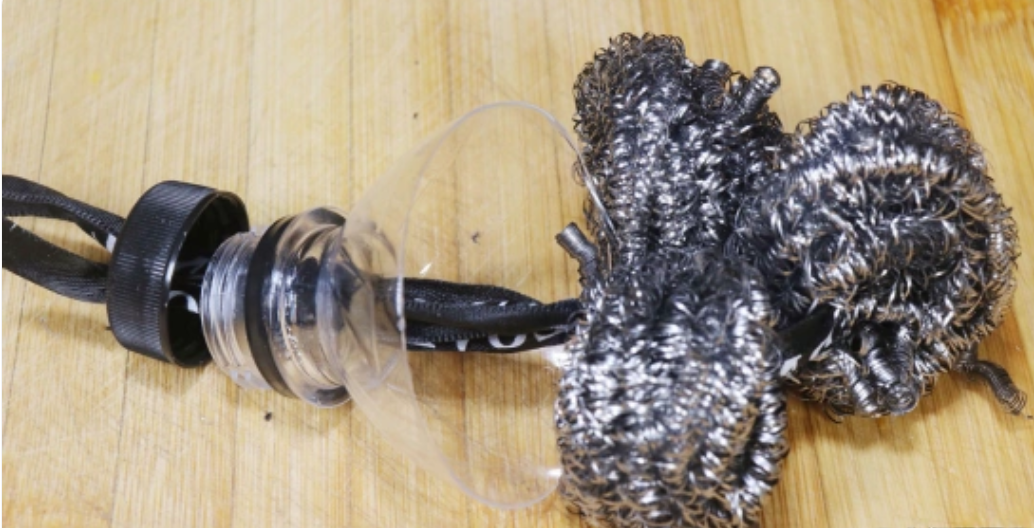 2. Tiếp theo, tháo nắp chai miệng trước, sau đó đặt nó lên thớt. Sử dụng một tuốc nơ vít Phillips để chọc hai lỗ nhỏ trong nắp chai, sau đó sử dụng một con dao nhỏ để phóng to các lỗ chọc một chút để hoạt động tiếp theo dễ dàng hơn. Ở đây, ba máy lọc len thép được chuẩn bị. Nếu đó là một chai đồ uống lớn hơn, chúng ta có thể thêm nhiều máy lọc len thép. Vì máy lọc len thép của tôi tương đối nhỏ, tôi sử dụng một chai cola thông thường. Đường kính của thân chai không lớn, và ba máy lọc len thép vừa phải. Sau đó, sử dụng bàn tay của bạn để đào một lỗ ở giữa máy lọc len thép. Tiếp theo, vượt qua một mảnh dây qua lỗ ở giữa. Cố gắng chọn một sợi dây dày như dây giày, để nó không bị hỏng trong quá trình sử dụng. Sử dụng phương pháp tương tự cho hai máy lọc len thép khác và buộc các máy lọc len thép lại với nhau theo hình tam giác.