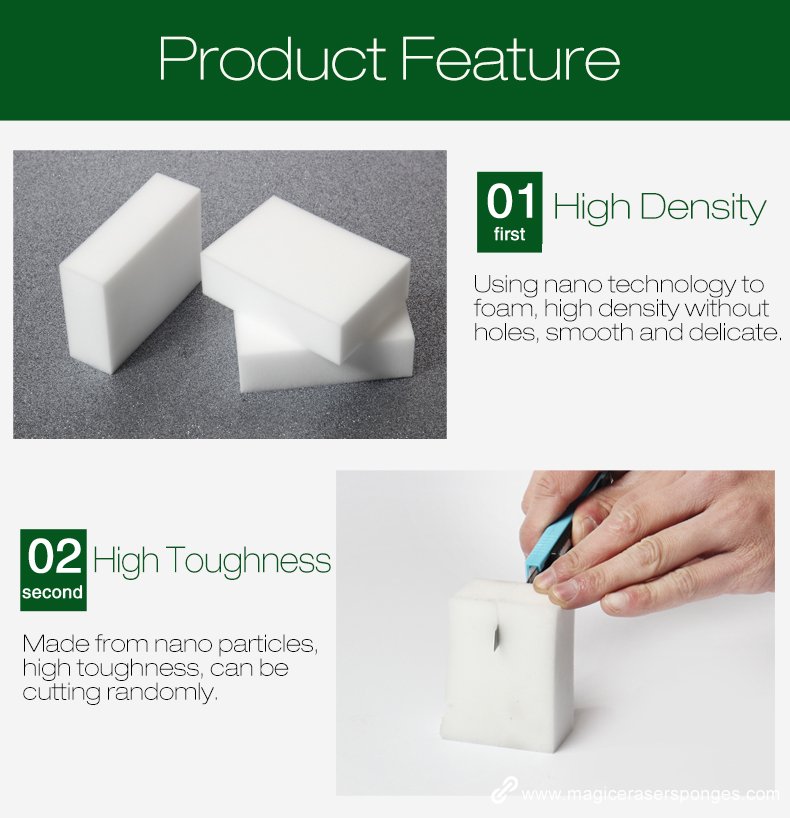 Melamine Sponge, một cơ thể đa lỗ cấu trúc vững chắc làm từ các hạt melamine, là một loại sản phẩm làm sạch thân thiện với môi trường. Nó được đặc trưng bởi sự vô vị, vô tội và vô hại. Khác với miếng bọt biển làm sạch truyền thống, mỗi hạt có mười nghìn lông mỏng, hoạt động như một chất tẩy rửa, loại bỏ các vết bẩn cứng đầu với lực tiểu thuyết của nó. Đồng thời, cấu trúc lỗ hổng mao mạch của nó có thể loại bỏ các vết bẩn cứng đầu một cách hiệu quả. Đó là một quá trình tự hủy hoại để đạt được hiệu ứng sạch đáng kinh ngạc. Đừng quên, bạn cần bất kỳ chất tẩy rửa hóa học nào nên được rửa sạch với nhiều nước hơn! Thích hợp cho bề mặt không bằng phẳng, tiết kiệm thời gian, tiết kiệm lao động, tiết kiệm nước và không có vết xước, đó là lựa chọn tốt nhất của bạn trong việc nhà.